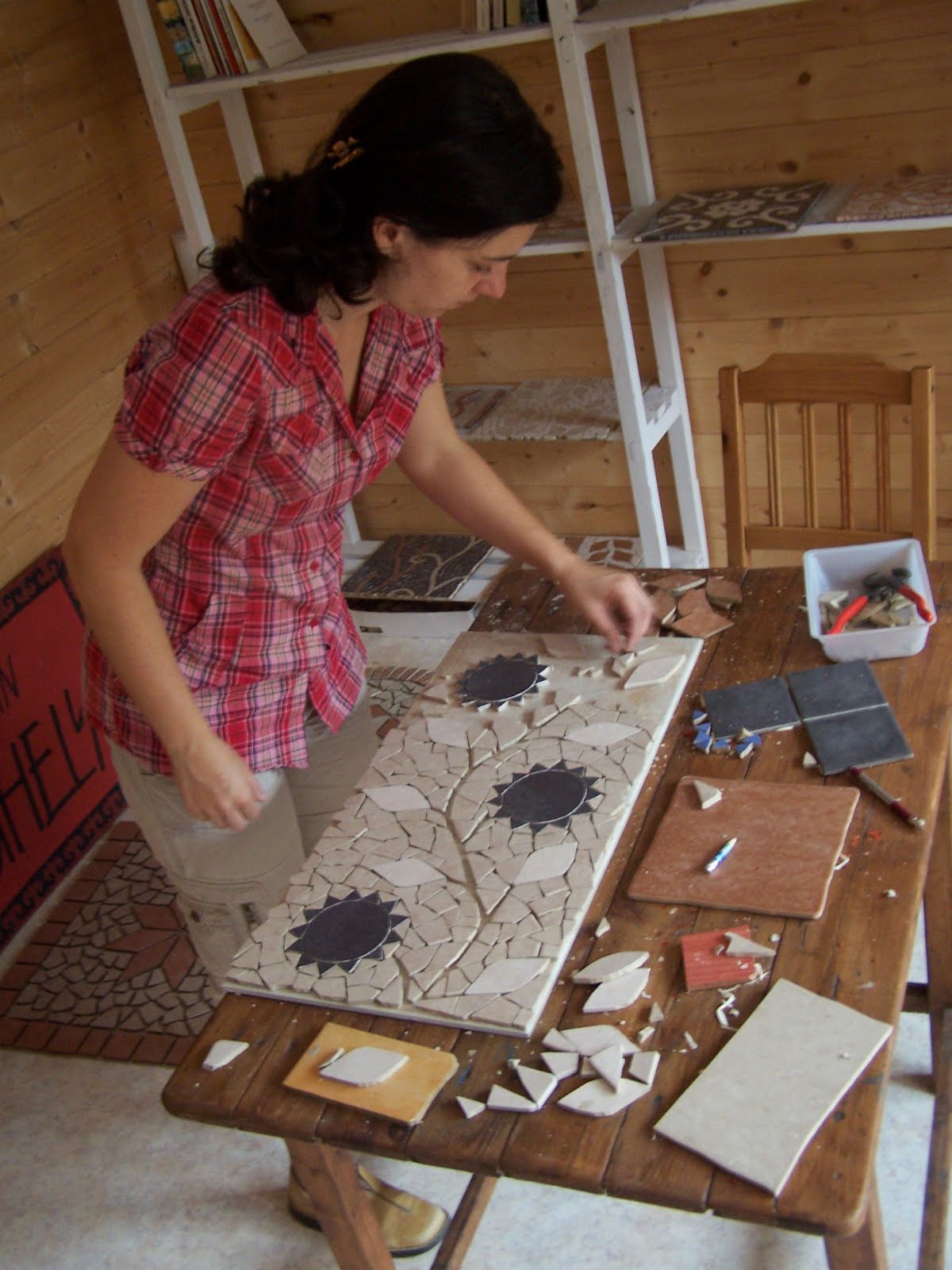 Teljesen véletlenül botlottam Csontos Kemény Katalin mozaik művészre az interneten, amikor egy munkámhoz kerestem fényképeket. Pár pillanat alatt meggyőzött a blogján látott anyag arról, hogy itt a helye a Gyémánt félkrajcárban. Katalin főiskolás kora óta foglalkozik komolyabban a mozaikkal, bár diplomamunkáját kazettás mennyezetekből írta és festette. Vác mellett, Kosdon található műhelyében alkot, mint mondja ez közel, mégis kellően távol van a főváros forgatagától. Heti két délután egy művészeti iskolában tanít képzőművészetet.