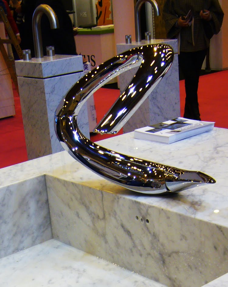 Triflow csaptelep, amelyet korunk építész nagyágyúja, Zaha Hadid tervezett (aki nem tippelte volna meg...:). Két lyukon folyik a víz, egyikből tisztított, másikból sima csapvíz. Akár tűz forrón.
