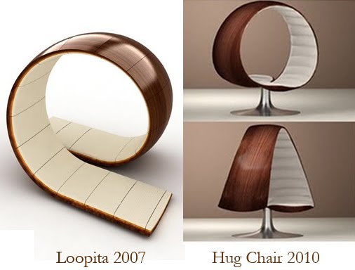 A Loopty Loop Loopita fekvő bútorszerkezet létezéséről 2010 nyarán értesültem, amikor egy barátom szólt, hogy látott egy, az én székemhez hasonló tervet. Ekkor vizsgáltam meg részletesen, az egyetlen szembetűnő hasonlóság (a közismert spirálformán kívül) a külső faszerkezet anyagválasztása volt. A sötét fa és világos kárpit használata igen elterjedt, több száz bútortervező használja, mivel ez eleganciát és igényességet kölcsönöz. Az említett design egy földön fekvő szerkezet, és nem fából van 360 fokban meghajlítva (mint a Hug Chair), hanem fadarabokból van összeállítva, így állítható hosszabbra és rövidebbre. Tehát sem szerkezetében, sem funkciójában, sem felépítésében nem hasonlít a Hug Chairhez.Ezen kívül ebben a cikkben azt vitatják, hogy abban az évben, amikor a Loopty Loop Loopita tervezője megtervezte ezt a spirálbútort, akkor egy másik tervező rég megtervezte, legyártatta és ugyanabban az évben meg is nyert egy nemzetközi designversenyt egy rendkívül hasonló, The Therapist nevű designjával.