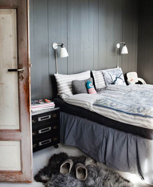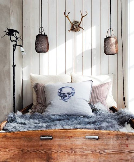 Múlt héten már egészen rám tört a tavaszi hangulat, de a hétvége egy huszárvágással lenyisszantotta a jókedvemet: majd odafagytam a kutyasuli erdős pályájára. A hideg búcsúztatására (most már tényleg...) egy melegséges norvég házikót találtam, sok rusztikus felülettel, állatbőrrel, fával. Én nyáron is kibékülnék ezzel az erdei lakkal!