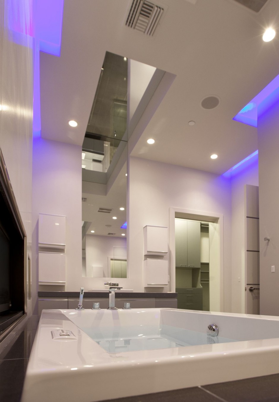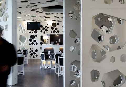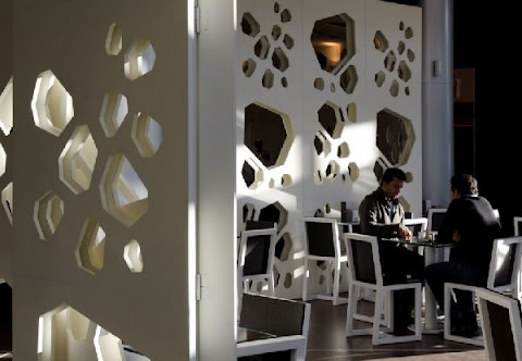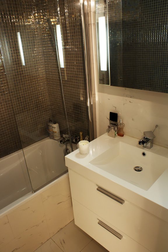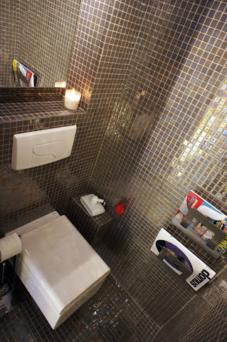 Déco-Design oldalon. A kis osztású mozaikcsempe optikailag növeli a teret, amelyre még a felületkezelés is rájátszik: az irizáló fényesség bizonytalanná teszi a határokat, ezzel tágítja a helyiséget. De nem csak ezért szeretem, hanem mert ott figyel nagy kedvencem a carrarai márvány (hatású burkolat) is. Nagy szívfájdalmam volt, amikor - kábé fél éve - egyik megrendelőm visszadobta a hasonlóra tervezett fürdőszobát (csak én fém hatású mozaikot használtam), mert hidegnek találta. Ami persze jogos. De akkor is szép! :)