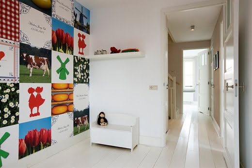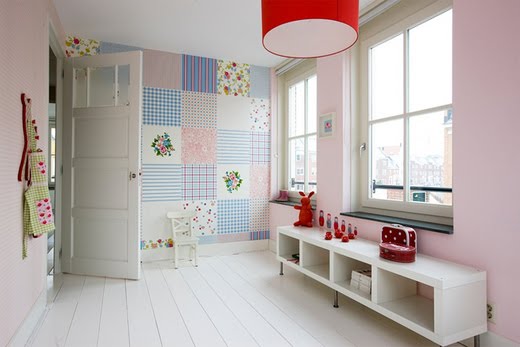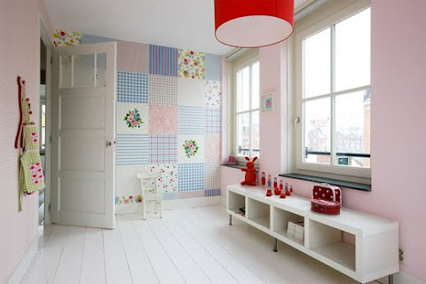 Kisgyerekek szobájába tünemény a patchwork tapéta. Össze lehet hozni több tekercs, vagy maradék tapéták kombinálásával, de egyedileg is készíttethető bármilyen minta erre szakosodott cégeknél (pl. itt).Forrás: vtwonen