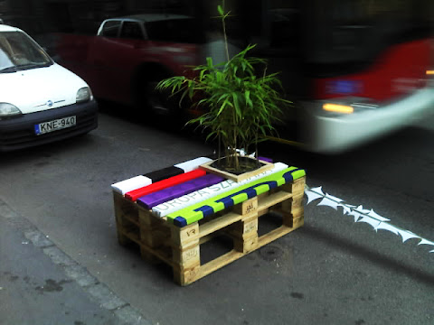 Ez pedig egy raklapból készült vízállóra ponyvázott növénytartó-pad.