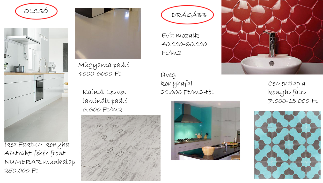 Ha a konyha egy helyiségben található a nappalival, az nyilván meghatározza a burkolatot, legelegánsabb, ha egyforma. Ez lehet hidegburkolat, valamilyen öntött padló (például műgyanta), vagy laminált padló (amelyet az illesztéseknél ragasztva teljesen nyugodtan bevihetünk a konyhába). A műgyanta ára mindenhol hasonló, a másik kettő viszont elég változó árkategóriában kapható. A padlólapok és a laminált padlók akciói egymást érik, érdemes jól körülnézni a piacon. 6000 Ft/m2-ért egy közepes kategóriájú padlólapot kapunk, ugyanennyiért (4-6.000 forintért) viszont megkapjuk a laminált padlók csúcskategóriáját, ami megszólalásig hasonlít a fa padlóhoz, csak szerencsésebb fizikai-kémiai tulajdonságokkal bír. Úgy általában azt gondolom, padlóburkolatból érdemes semlegeset dizájnt választani, hogy minden energiánkkal a lényegre koncentrálhassunk, a falburkolatra...