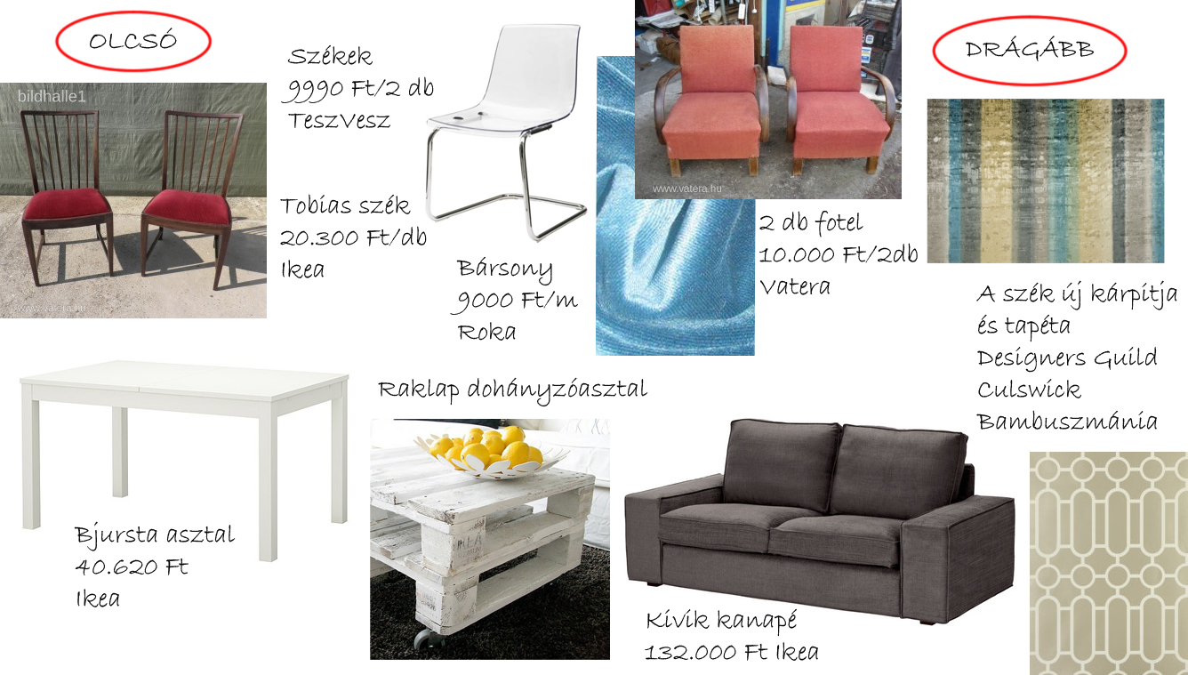 Szóval a kommersz (persze attól még nagyon szép) kanapé mellé (nagy kedvencem a Kivik) érdemes különleges foteleket keresni. Elmehetünk bolhapiacokra, vásárokra, ha élvezetünket leljük a kutatásban, de a kényelmesebbek egyszerűen kiválaszthatják őket az Internetről is (Vatera, TeszVesz, Expressz, stb...). Itt álljunk meg egy pillanatra, nézzük meg a dolog buktatóit. Sokan mutattak már nekem rémesen otromba bútort, hogy micsoda klassz formájú cuccot lőttek a neten fillérekért... Ha nem vagy jártas a különböző korokban, stílusokban, nincs általános rálátásod, és bizonytalan vagy a választásban, akkor a legjobb, amit tehetsz, ha veszel egy-két egyszerűbb, általában art deco-nak hirdetett fotelt. Állapottól függően 5-10.000 forintnál többet nem érdemes adni egy darabért, úgyis el kell vinni kárpitoztatni. Nagyon meg kell nézni, mit vásárolunk, mert egy teljes rugó cserés támadás munkadíja 50-70.000 forint is lehet, egy megkímélt, vagy már korábban felújított fotel áthúzását viszont 15.000 Ft munkadíjból megúszhatunk. Én imádok bársonnyt, vagy egy alcantarához hasonló anyagot használni a célra, ezek ára 5.000 és 10.000 Ft között mozog. Egy ilyen fotelhez körülbelül 3,5-4m2 anyag szükséges.