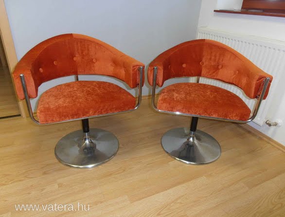 Ezzel a jó formájú forgó fotel párral már régóta szemezek. A fémváz gyönyörű állapotban van (és ez a lényeg, a krómoztatás kisebb vagyonba kerül), nem mondom, a huzat elég gáz... De ha azt lecseréljük, lakásunk legkülönlegesebb darabjai lehetnek. 40.000 forintért kínálják.