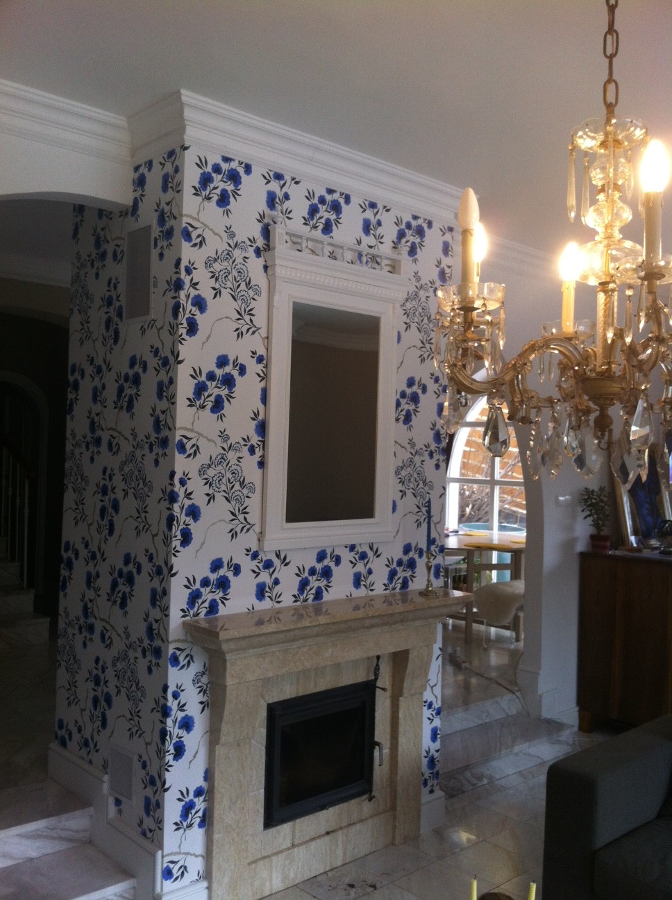 ... mármint a lakberendezésben. Ez az örökségből megmaradt nagy darab régi tükör, amelyik - valljuk be - majd' agyon nyomja a kis kandallót, milyen légies lett fehérre festve. Pont fordítva, mint az öltözködésben... :)