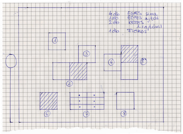 3. Vegyünk elő egy kockás papírt, ahol 1 négyzet legyen 10 cm. Rajzoljuk fel a falat (én egy átlagos, 2,70 belmagasságú lakás egyik falnézetét készítettem el), és könnyítsük meg a viszonyítást azzal, hogy felrajzoljuk a képbe magunkat is. Így látni fogjuk például, hogy mi kerül a mi szemmagasságunkba. Persze felrajzolhatjuk a gyereket is. Ebbe a négyzetbe (tetőtér esetén persze nem...:)) próbálgassuk bele az elemeket. Javaslom, hogy ceruzával dolgozzatok, és legyen kéznél radír... Én sraffoztam az ajtósnak szánt elemeket.