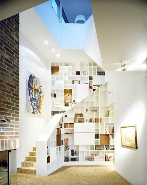 És persze örök kedvenc a lépcsők oldalának ilyetén beépítése. Jól meg kell tervezni, mert egy könyvespolcnak bőven elég 30 cm mélység (egy lépcsőnek meg a nagyon minimum programban is kell hatvan).