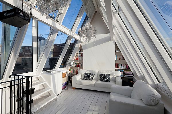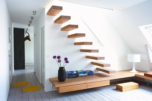 És az örök kedvencem (nincs blog, amelyiken ne szerepelt volna már...:)) a lépcsőkorlát és falipolc tökéletes összhangja. Ilyenkor sem kell kihasználatlannak lennie a lépcső alatti térnek: a legmagasabb pontja felőli falon ajtón keresztül be lehet menni, és akár raktárként használni.