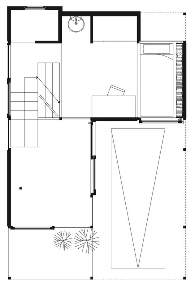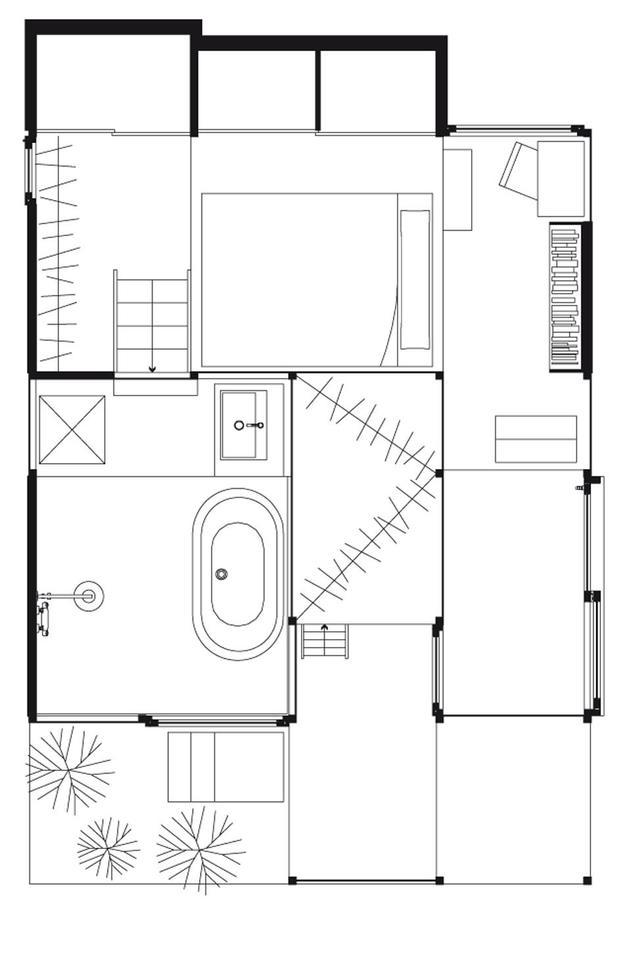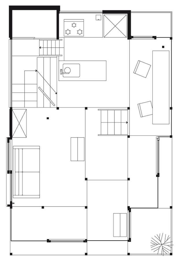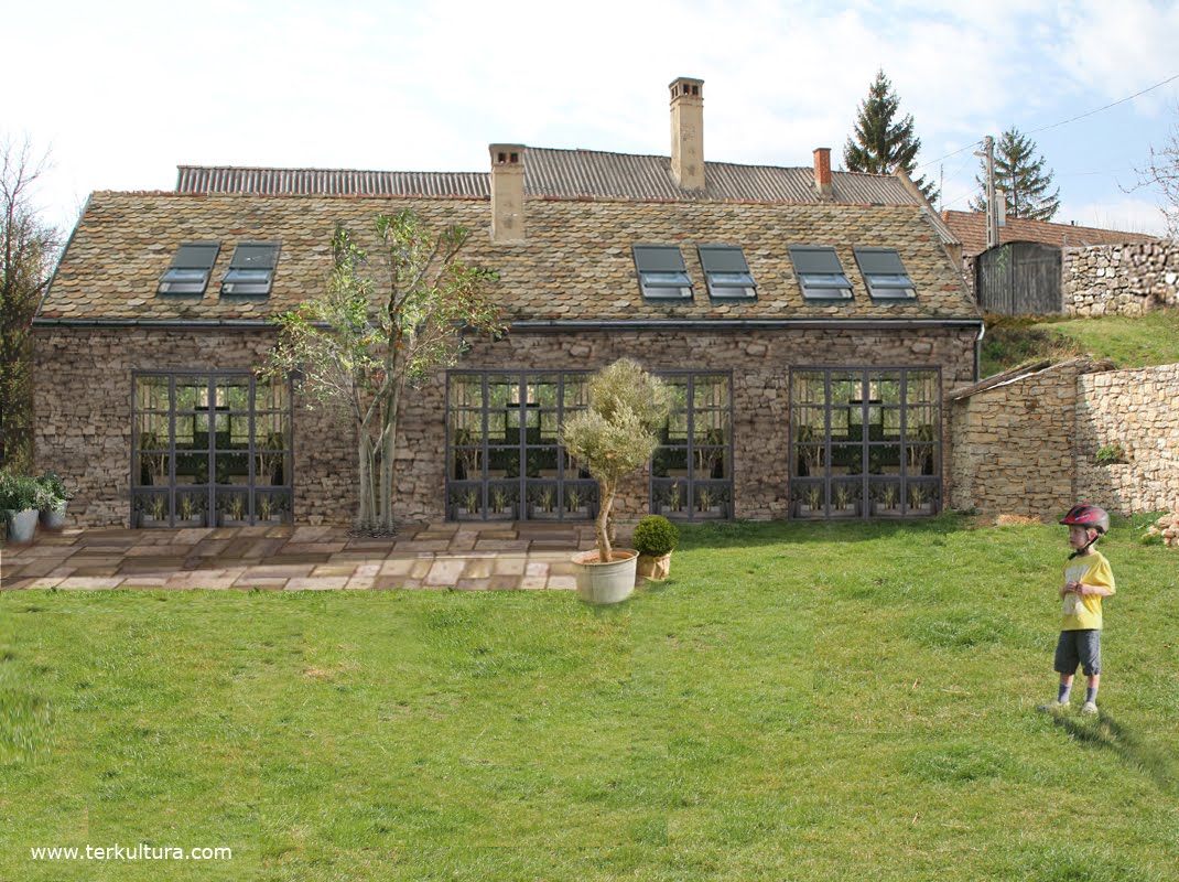 A földszinten konyha-étkező-nappali-fürdő-szülői háló található, innen megközelíthető a tévénéző, olvasgató, elvonuló galéria. Az alsó szintre például nem is szeretnék tévét, csak egy hatalmas, nyílt tűzterű kandallót, olyan majd' embernagyságút, kőből. Télen, meg a hűvösebb nyári estéken, amikor teljesen összenyitjuk a házat a természettel, nagyon hangulatos lesz... A fürdőszobában is van minden, nem tudtam például lemondani a térben álló kádról, ahonnan szép kilátás nyílik majd a kertre. Ez a két kis felesleges luxus emeli majd az egyébként nagyon egyszerűre tervezett épület fényét. Na meg a mennyezetig érő üvegajtók.