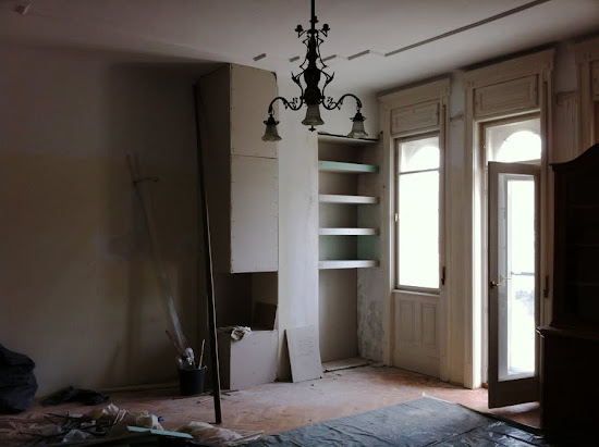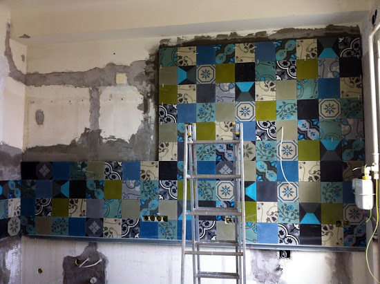 A nappaliban egy kémény és fal közötti egy elég stílusidegen (egyébként nagyon szépen kivitelezett) szekrénybeépítést hagytak ránk a korábbi tulajdonosok, amit közös akarattal felszámoltunk. A megrendelő régi álma volt egy kandalló, amely sajnos itt se valósulhatott meg maradéktalanul, ugyanis a képen látható kémény sajnos nem a miénk, a költségek viszonylag alacsonyan tartása miatt pedig nem terveztünk behúzni újat. Így mérlegelve a lehetőségeket és kívánalmakat, végül egy bioetanol kandalló beépítése mellett döntöttünk. Ennek a gipszkarton váza látható a képen. A korábbi állapot:Ebbe a lakásba érkezik a korábban már posztolt patchwork cementlap. Egy délelőtti fáradtságos munkával kiraktam a padlóra a pontos sorrendet, amelyet a burkolók tegnap felragasztottak.Hát így állunk egyelőre. Izgalmas dolog ez, pláne, hogy ennyire gyönyörű a lakás!