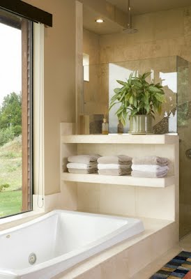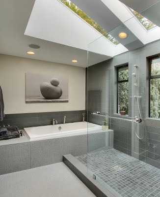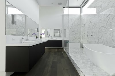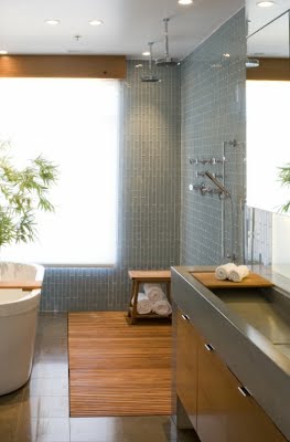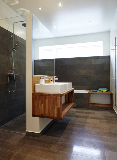 Nálunk - a tervek jelen állása szerint legalábbis - nem ilyen lesz a fürdőszoba, de azért vessetek egy pillantást arra a nem annyira ritka, de állati klassz megoldásra, amikor a zuhanyfülkébe két oldalról lehet belépni, az előtétfalon pedig ott figyel a mosdó. Nagyon menő a kád melletti fa beépítés is, ami a mosdószekrény formájára reflektál.