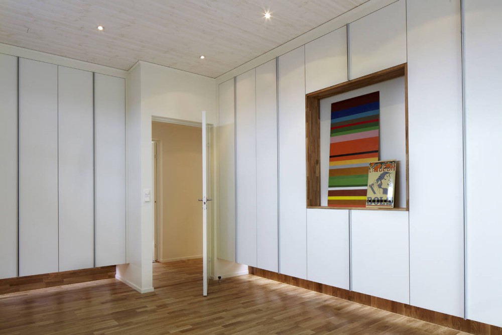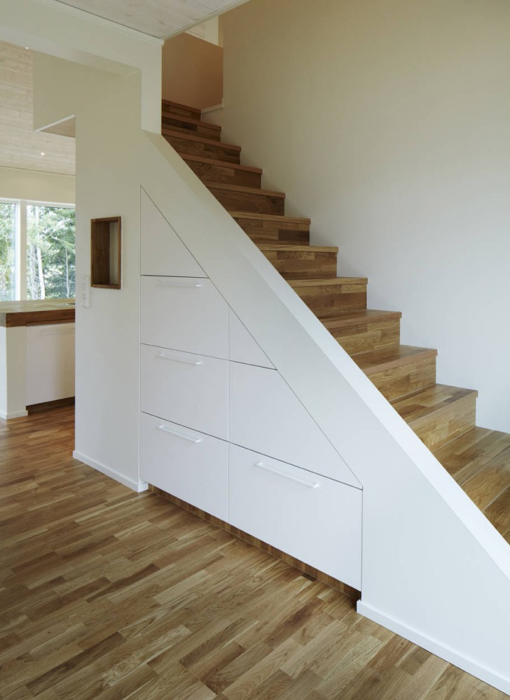 A lépcső alatti tér mindkét helyen jól kihasznált. A galéria alatt például kis tároló helyiség található, amit egy tolóajtónak átalakított régi pajtaajtó nyit. Ide kerül majd a mosógép és a sok háztartási kütyü (porszívó, felmosó, stb...). Az emeltre vezető lépcső alatt pedig beépített szekrények nyelik el a sok csetreszt.