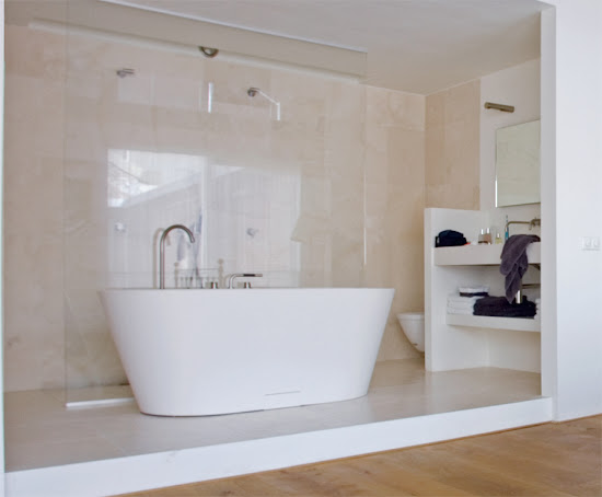 Igazából mindig vonzott a gondolat, hogy a kádam a hálószobában legyen, mert egy jó könyvvel (borral, gyertyával) eltöltött fürdő nekem nem tisztálkodást, sokkal inkább a relaxálás élményét jelenti, amihez vonzóbbnak tűnik egy szoba hangulat. E gondolat mentén viszont miért ne lehetne az egész fürdőszoba (persze, csak ha saját...) a hálószoba része? Nyilván a párkapcsolatokban kialakult szokások és az egyéni preferenciák kialakítanak bizonyos kereteket, a legkevésbé szemérmesek (megrögzött agglegények és szinglik) például a WC-t is bevehetik a buliba. Nekem ez már elég erős... Még ha másért nem is feltétlenül, a szaghatások miatt mindenképpen felhelyeznék egy tolóajtót, amelyet csak bizonyos szituációkban zárnék... Kecske és káposzta. Mit gondoltok? :)