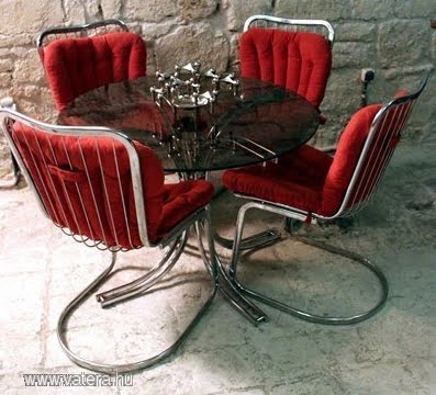 Pont nemrég állítottam össze a Berendezem rovat részére egy "szőrös" étkezőt (ITT), ahol az egyik főszerepet a krómozott cső étkezőszék játszotta. Az alábbi szett (a 4 db szék) 60.000 Ft-ért megvehető ITT.
