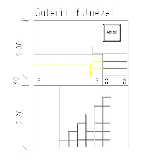 A fürdőszoba, és az átjáró is a helyén marad, de mindkettő tetejéből lecsippenteném a galériát. Nem említed a belmagasságot, de a mellékelt fotó alapján éltem a reménnyel, hogy 4,5 méter... Ha kicsit kisebb, akkor a galériát kell alacsonyabbra venni. Végtére is csak aludni fogsz ott... A feljutást a nappaliból oldanám meg. A lépcső alatti rész a nappali felől könyvespolcként funkcionálhat, a fürdőszoba felől megnyitva pedig szekrényként, de ide rejteném - egymás fölé - a mosó és szárítógépet is. A zuhanyzóba lehetne egy pici, opálüveges, műanyag ablakot tenni. Felette is lehetne egy ablak - ez már a galériát szellőztetné.