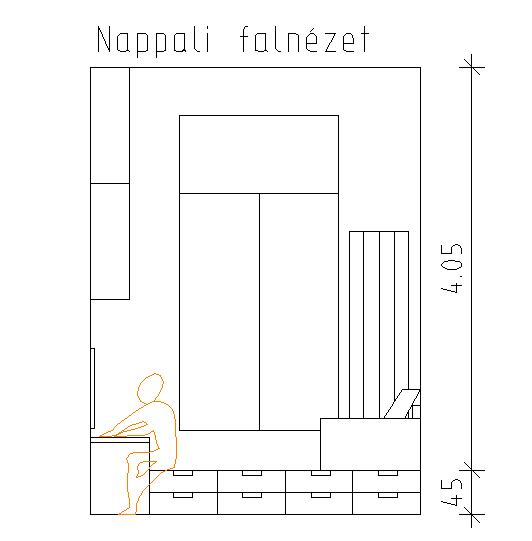 Nem akarom magamat fényezni, de azt hiszem elég jó ötletem akadt a tárolás/dolgozás/tv/kanapé megoldásra is. A kulcs egy dobogó, amely a tetején felnyitható, így a ritkábban használt dolgok ide elsüllyeszthetők, oldalról pedig fiókosak, ahova a minden napos cuccok (akár ruhák) kényelmesen elférnek. Ha úgy érzed, gond lenne 45 cm-re feljutni (bár fiatalon ez nem hiszem, sőt, még nekem is rendben lenne..:)), az alsó fiókos rész lépcsőként kihúzható lehet. A dobogó lényege egyébként nem is a tárolás, hanem, hogy összehozza a dolgozó-tv-kanapé hármast egy kényelmes egységgé. Valahogy így: