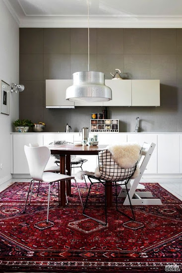 Tetszik, hogy a konyha-étkező perzsa szőnyege összehozza a modernet a régivel. :)
