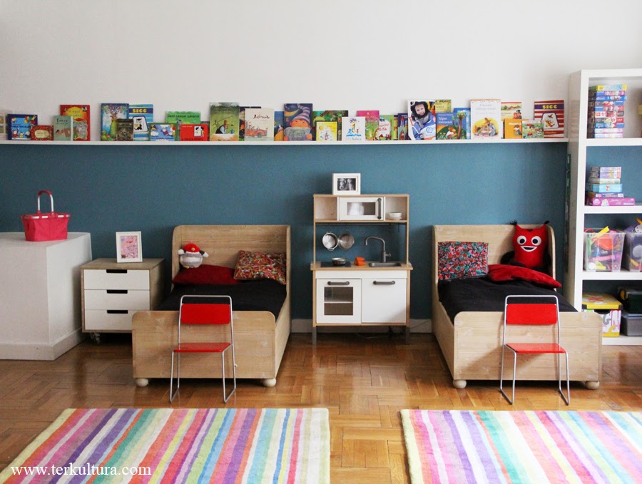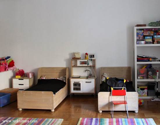 Miután tele vagyunk gyerek cuccokkal, kötözés után az összes létező, máshová el nem paterholható polcos elem, doboz, irodaszekrény (stb.) bekerült a gyerekszobába. Tér az van, 40 m2-ről beszélünk, az eredmény viszont elég siralmas lett: a fal mellé tolt ilyen-olyan tároló alkalmatosságok egy kietlen térben. Az ágy körüli rész így nézett ki, nem valami vidám látvány, valljuk be: