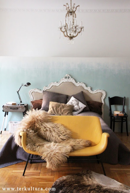 Ez tök szép lett, de valahogy uncsi volt. Éreztem, hogy kell rá még valami, és akkor eszembe jutott, hogy előző héten írtam az ombre (=színátmenetes) fal készítésének titkáról (ITT), és arra gondoltam, kell legyen ebben valami sorsszerűség, szóval legyen... :) Az ágy (és kofferláb) szürkésfehér festékével nekiláttam ombrésíteni a falat. Arra gondoltam, ennek így még értelme is van: olyan, mintha felhő lenne a fejünk felett. Ez is zománc festék. Három kör kellett a - szerintem - szép hatás eléréséhez. Használtam hozzá ecsetet, egy vizes szivacsot, és egy száraz rongyot. Első körben finom füst szerű hatást értem el így: ecsettel festés - vizessel finoman törlés - szárazzal törlés. A vizes szivaccsal törlésnél finoman csíkos lett a dolog, a száraz rongy "elfelhősítette". Aztán megint nekiláttam, ezúttal kisit erősebben raktam fel a fehéret, a száraz rongy kevesebb szerepet kapott, de még néhol kellett a csíkosságot javítani. A harmadik réteget már csak egészen felül festettem rá, hogy teljesen fedjen, és éppen csak elmostam a szélét vizes szivaccsal. Így készült el a felhős nyári egünk az ágy mögött...