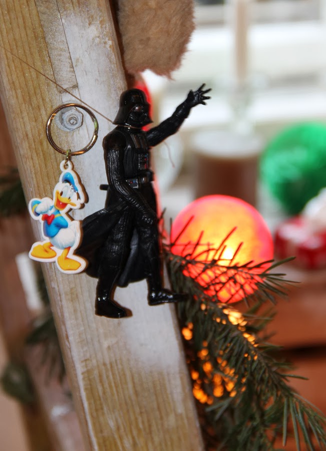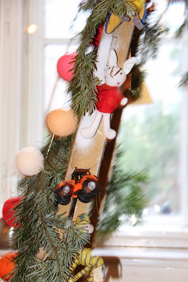A gyerekekkel megbeszéltük, hogy a kisebb méretű játékaik pont jól fognak mutatni a kompozícióban. Tök jól szórakoztunk, miközben gyűjtögettük a ládákból a kisállatokat és szuperhősöket, amelyeket aztán együtt, cérnával felkötöztünk a létrára. És íme, kész a karácsonyfánk, egy nappal hamarabb, hiszen úgyis olyan rövid ideig fogjuk élvezni... :)