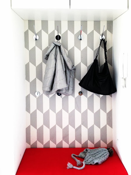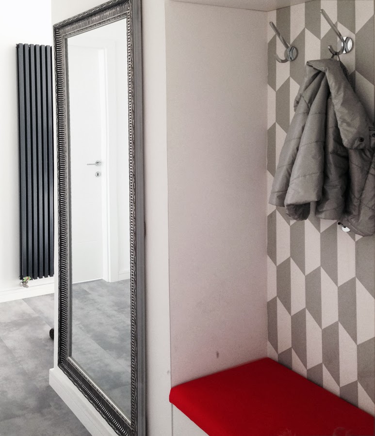A tapétán kívül a piros kiegészítők, párnák vezetnek még végig a lakáson, ezért kapta a cipőtartó teteje az élénk színű kárpitos borítást, amely így leülő funkcióval bővült.És végül egy kis csicsát mégis csak sikerült becsempésznem díszes tükörkeret képében… :)