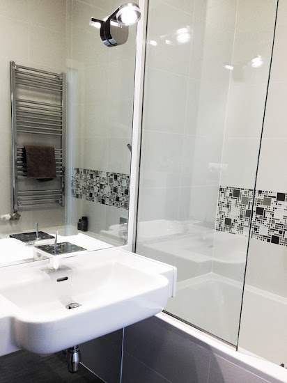 A falburkolat hófehér lap, amelyet a kád és a beépített wc tartály felett üvegmozaikkal dobtunk fel.