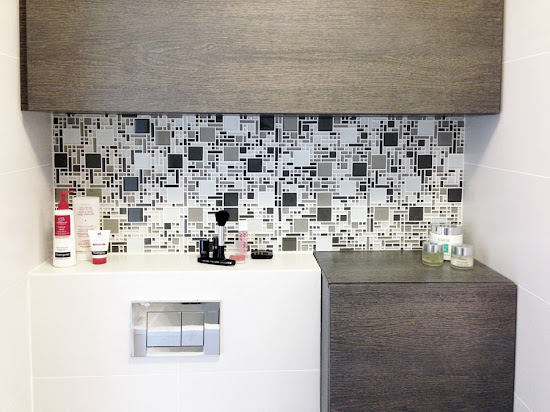 Itt még hiányzik egy kis kiegészítő: a tartály és a bútor tetejére egybefüggő, a mozaik egyik szürkés-barnájával egyező színű üveglap érkezik.