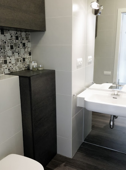 A wc falát - a mozaikos részt leszámítva - teljes egészében bebútoroztuk. A bútor színét a fára megtévesztésig hasonlító kerámia padlóburkolatról másoltuk. A "csalás" remekül sikerült: a Board-A asztaloscsapat kitartó próbálkozásainak köszönhetően gyönyörű a harmónia, senki meg nem mondaná, hogy nem azonos anyagból készültek! :)