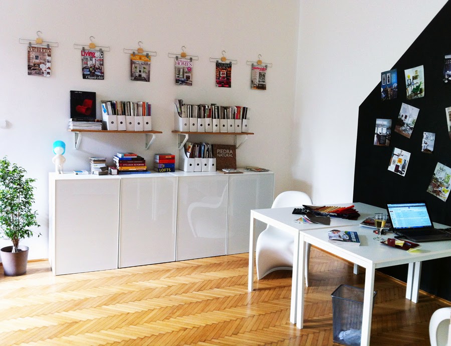 Kinga és Tamás asztala a házikó alakú inspirációs tábla előtt. Az éppen aktuális projektekhez tartozó fotókat, magazinkivágásokat tesszük ide fel, aminek mentén tervezzük az enteriőrt...
