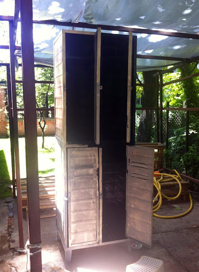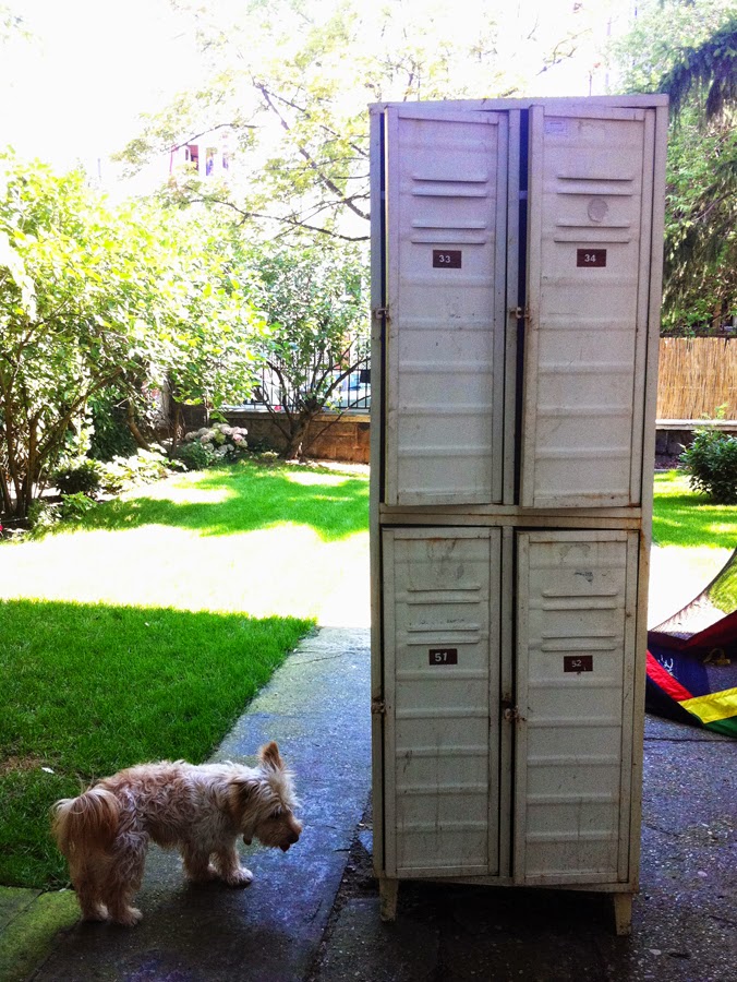 Arra gondoltam, hogy a közösségi térben dolgozó embereknek is biztos szükségük lesz egy olyan szegletre, ahová féltett "kincseiket" tudják rejteni (pl. nem akarják haza vinni a laptopot, de mondjuk tartanak tőle, hogy az éjjel eladom egy orgazdának...). Ezért sokáig gondolkodtam, hogy milyen típusú zárt szekrényt kéne bevetni a célra, amikor eszembe jutott egy igazán stílusos megoldás. Lakattal zárható fém öltözőszekrényekre lesz szükségünk... Addig kutattam, míg találtam két négyeset (ami nagy szerencse, mert összesen nyolc zárható egységre van szükségünk), 20.000 Ft-ért... Na nem mondom, elég mocskosak voltak, és rozsdásak, sokáig is tartott, mire rászántam magam, hogy elkezdjük a munkát. Őszintén szólva nem is én voltam a fő munkaerő, hanem Tamás és Kinga - a két már nem is olyan új kolléga... - vetették rá magukat a projektre, és kenték le a szekrényeket. :) Szerintem nem sejtették, mekkora meló ez...