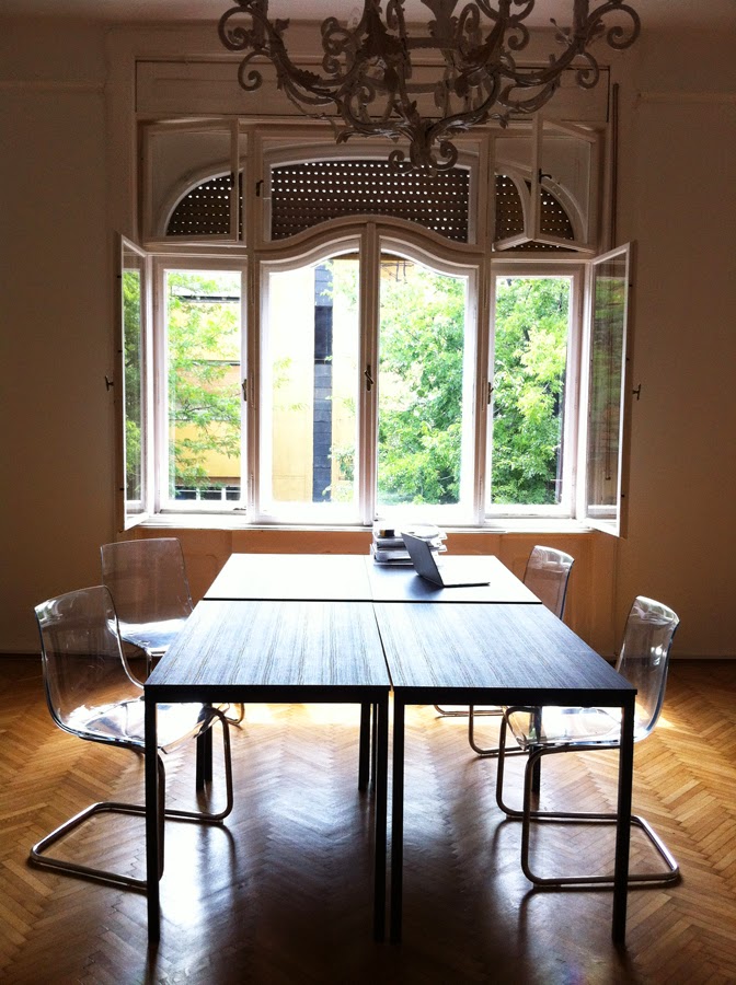 És ide várjuk a munkatársakat... Az asztalokat elválasztó virágvályú, az olvasólámpák, az asztal alatti konténerek, a dekoráció és a polcok ma-holnap megérkeznek. Két asztal (és két helyiség) már elkelt, de 4-6 még várja leendő bérlőit! Részletek ITT.