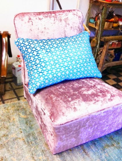 Egy réges-régi art deco fotel kap új ruhát éppen, amely egy szép családi házba kerül majd... Lilás rózsaszín bársony huzatot választottunk hozzá a megrendelővel és egy türkiz mintás anyagot párnának. A kárpitos most küldte ezt a fotót az elkészült darabról, a lába és a karfája még szépítés alatt. Szerintem isteni lesz, de sajnos a párna nagyobb lett a kelleténél. Persze ez nem baj, majd kisebbre veszi, ez most itt a teszt üzemmód...