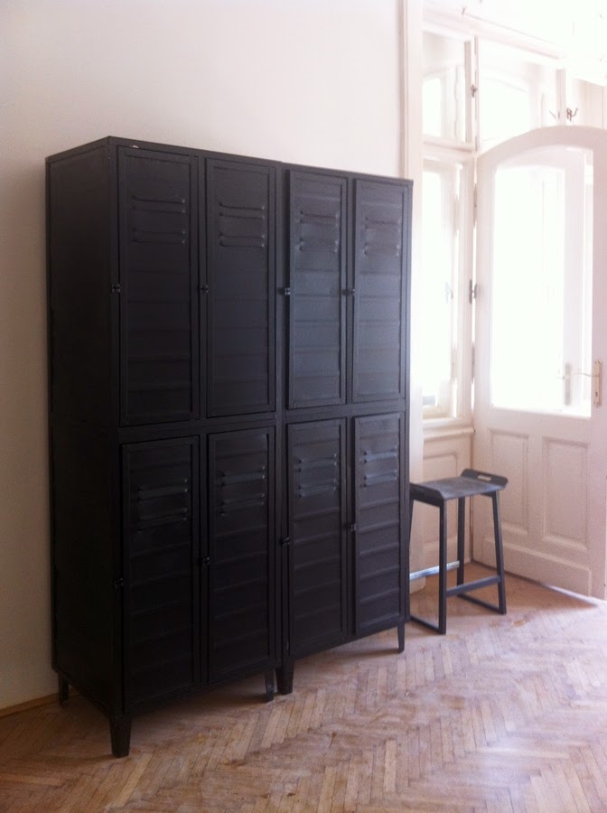 Arra gondoltam, hogy a közösségi térben dolgozó embereknek is biztos szükségük lesz egy olyan szegletre, ahová féltett "kincseiket" tudják rejteni (pl. nem akarják haza vinni a laptopot, de mondjuk tartanak tőle, hogy az éjjel eladom egy orgazdának...). Ezért sokáig gondolkodtam, hogy milyen típusú zárt szekrényt kéne bevetni a célra, amikor eszembe jutott egy igazán stílusos megoldás. Lakattal zárható fém öltözőszekrényekre lesz szükségünk... Addig kutattam, míg találtam két négyeset (ami nagy szerencse, mert összesen nyolc zárható egységre van szükségünk), 20.000 Ft-ért... Na nem mondom, elég mocskosak voltak, és rozsdásak, sokáig is tartott, mire rászántam magam, hogy elkezdjük a munkát. Őszintén szólva nem is én voltam a fő munkaerő, hanem Tamás és Kinga - a két már nem is olyan új kolléga... - vetették rá magukat a projektre, és kenték le a szekrényeket. :) Szerintem nem sejtették, mekkora meló ez...