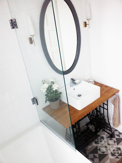 Két fürdőszobánk van, egy kádas és egy zuhanyzós. A kádasba került a régi LADA varrógép vázából kialakított mosdópult. A képkeret régi szöszis darab (csak lefestettem szürkére), a két falikart egy olasz bolhapiacon vásároltam. A varrógép vázat pedig ezúton is nagyon köszönöm Gigiéknek! :)