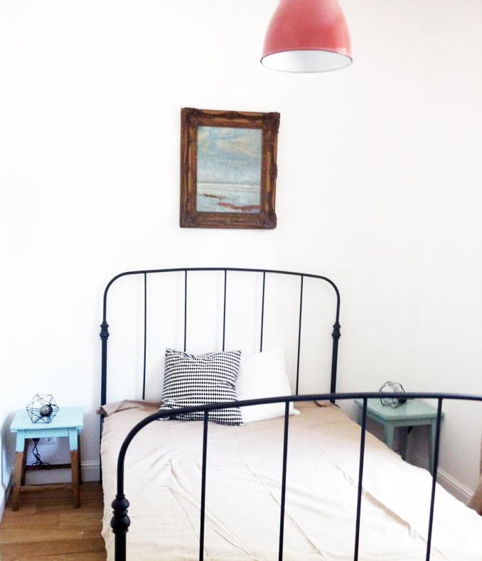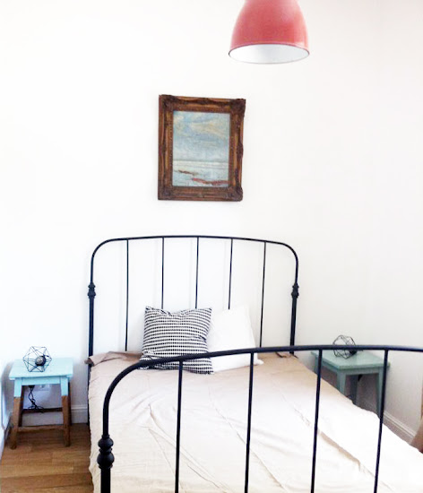 A legkisebb szoba az újonnan épült részben található. Az 140 széles fémágy régi Ikeás darab, én a neten találtam egyet, a két stokit Pestről hoztam le. Az asztali lámpa új felfedezés - Eglo Vintage, a mennyezeti pedig szintén ArtKraft ipari darab. A balatoni témájú képet a falon egy Pintér aukción vásároltuk.