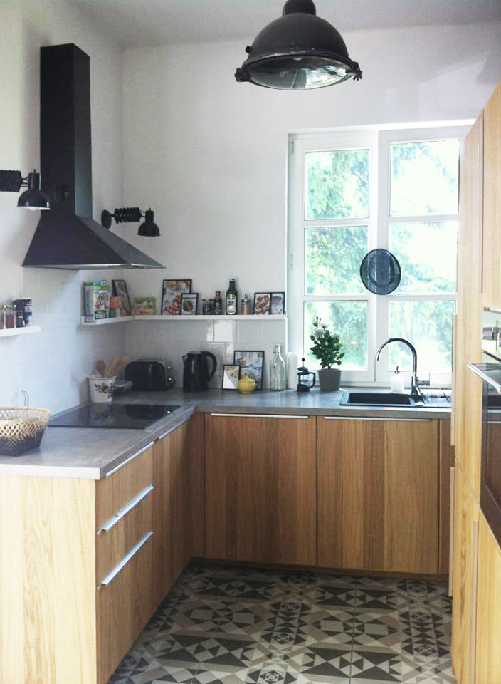 A verandáról az "Iván szobájából" kialakított konyhába érkezünk. A konyhabútort és a gépeket az Ikeában vásároltam. A betonszerű pultot a Betondekor (ITT) alakította ki nekem. Egy méretre vágatott, duplungolt natúr MDF lapot kent le mikrotoppal. A pult feletti falat, mint minden vizes helyiségben, egyszerű Zalakerámia Carneval 15x15-ös, magasfényű fehér csempével borítottuk, amelyeket keskeny polcokkal zártam le. Ezeket egyébként az Ikeában kapható, Ribba képtartó polcból vágtam ki. A mennyzetről az ArtKraft ipari lámpája lóg, a fali kihúzhatós lámpákat Argentínából hoztuk be.