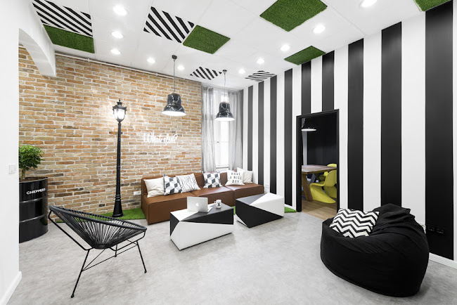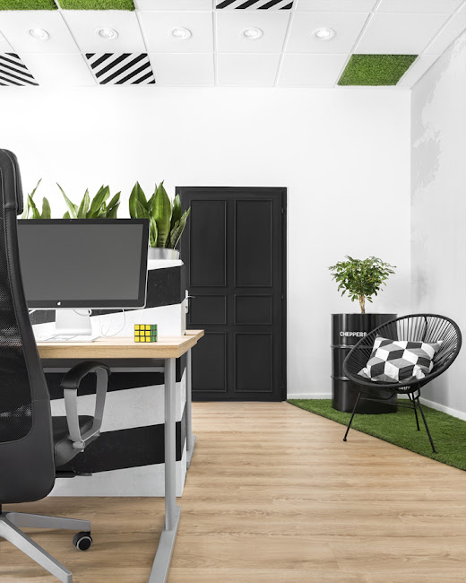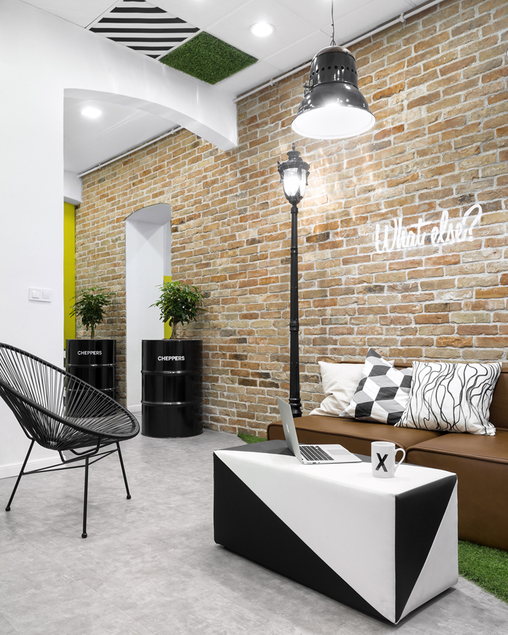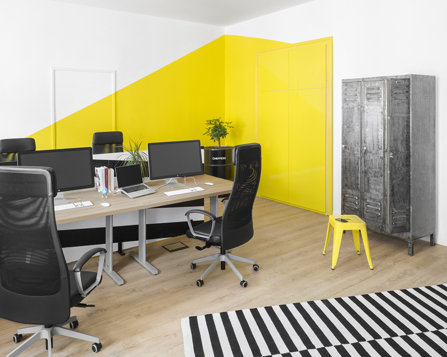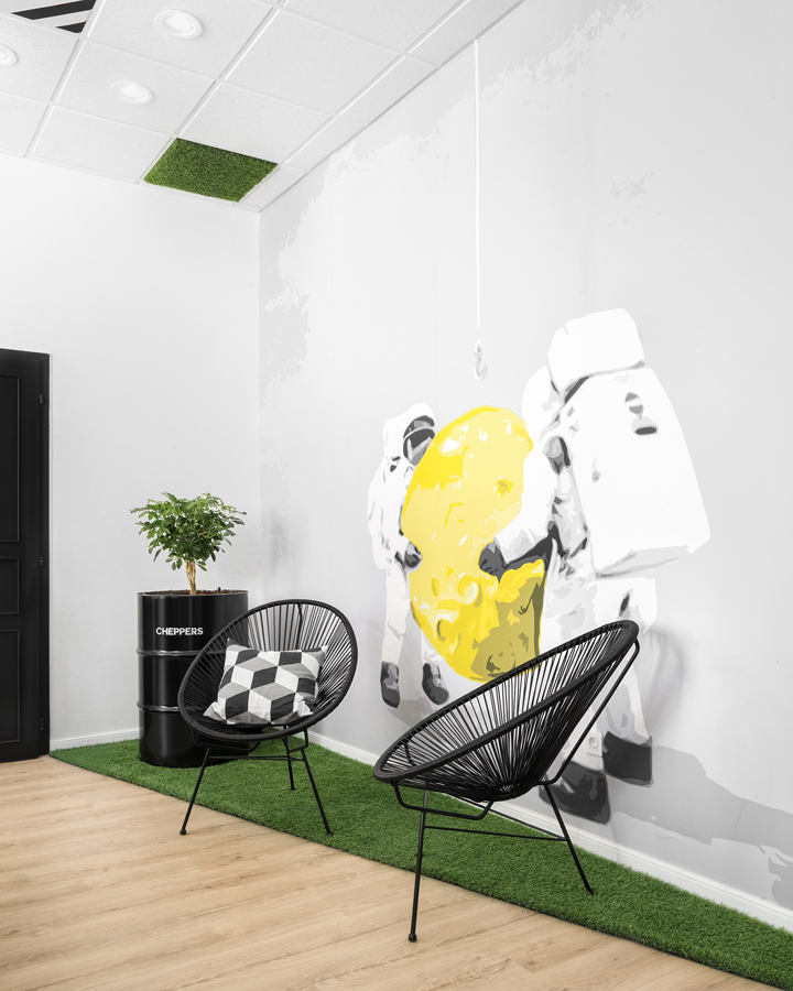 A Cheppersnél nem csak a közösségi helyiségekben, vagy a "skype szobában" lehet kicsit elvonulni: minden irodában kialakítottunk lazulásra alkalmas kis sarkot. Így kerültek be a babzsákok, a trendi drótfotelek, az egyedileg készített kárpitos bútorok és a sárgára festett kerti pad.