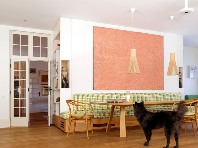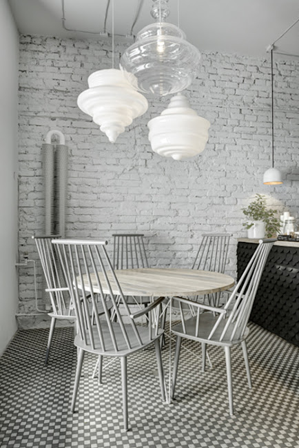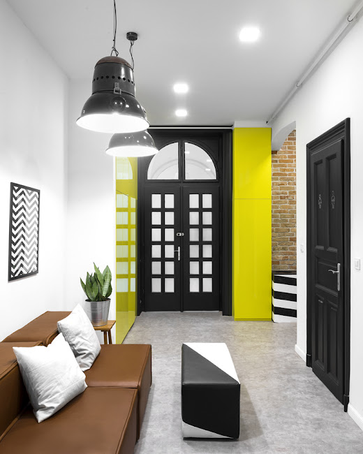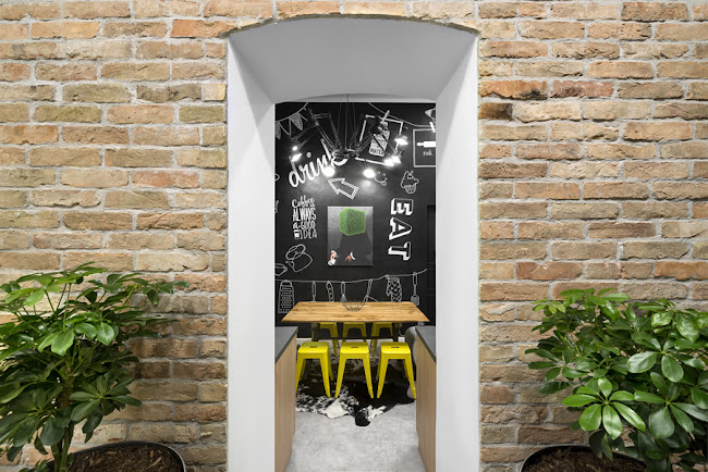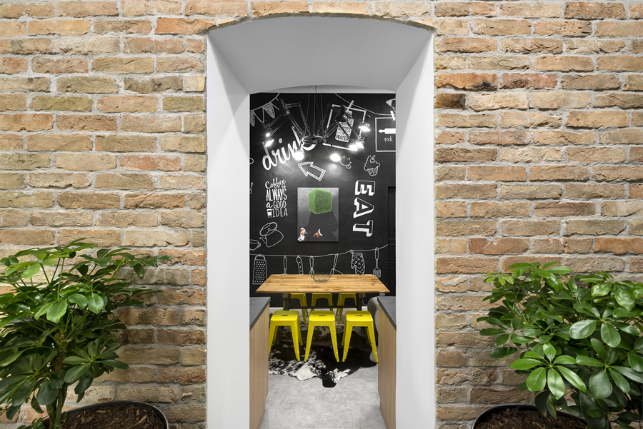 "Természetesen" van téglafalunk - hányszor kapom meg, hogy ez a mi védjegyünk… :))). De hát Istenem, ha egyszer a meleg színeivel olyan barátságossá varázsolja a teret… A közösségi tér, így hangulatában kikerült az utcára, azaz teljes egészében sikerült leválasztani az irodáról… Ez szerintem óriási előny, amely maximálisan segíti az elvonulást. A gondolati kötést a sárgára festett kerti pad adja meg, amely az egyik iroda helyiségben található...