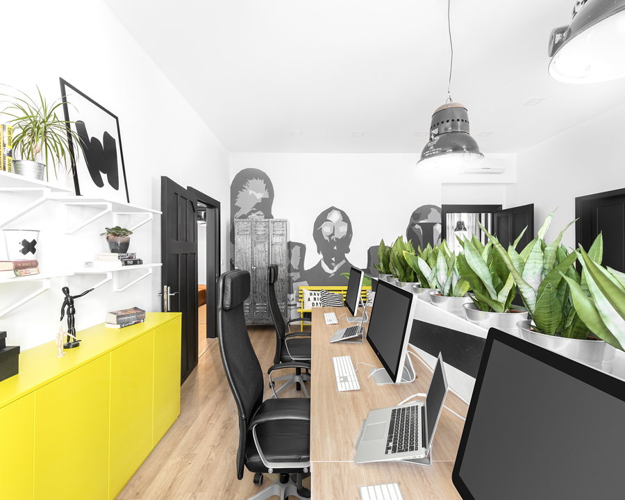 Közösségi iroda tér. Az osb virágtartó kellően szeparál, de csak amennyire igény van rá. Az anyósnyelv pedig kiírthatatlan növény, tökéletes választás egy férfiuralmú irodába. Nem, mintha én - nő létemre - ne volnék növénygyilkos, szóval elnézést a szexista megnyilvánulásért!!!
