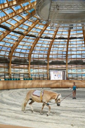 Hát ez tényleg nagyon szép, én is szívesen lovagolnék benne!:-) Tényleg jó látni, hogy tehetséggel és fantáziával, hogyan lehet megújítani a klasszikus lovarda építészetet. Nagyon tetszik, hogy mennyire világos, viszont milyen ravaszul és organikus módon oldották meg például az árnyékolást is egyszerre. Én pont azt nem szerettem eddig a fedett lovardában, (bár a lovak mindig kárpótoltak érte:-) hogy nincs meg az a "szabad ég" érzés közben. Ez viszont biztos király lehet éjjel-nappal, esőben is a hatalmas tetőablakoknak köszönhetően:-)