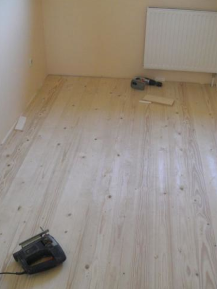Először is egy világosra lazúrozott fenyő hajópadlót raknék le. A neten kutatva találtam egy mestert (most a fotó miatt kerestem - Molnár Kálmán - ITT), egyébként bármely kivitelező megoldja és ez nem egy drága dolog.