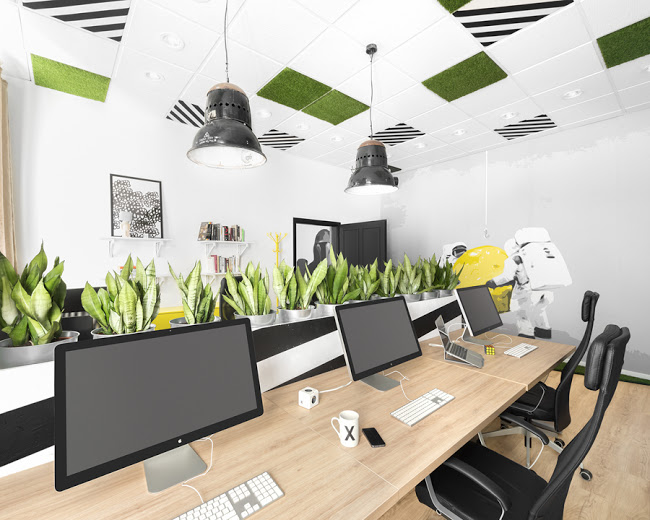 Aztán legutóbbi munkáinkban is hangsúlyosan megjelenik a zöld. Itt egy hatalmas fikusz áll a sarokban.