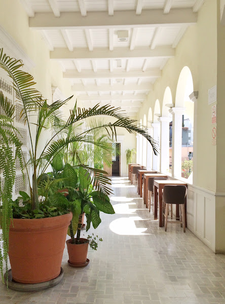 Magát a vendégteret az üveggel lefedett belső udvarból alakították ki, az épület jellegétől eltérően meglehetősen modernre. Az egésznek olyan kellemes az atmoszférája, a sok lelógó zöld, a világos bútorok, hogy nem érzek diszharmóniát az eredeti épüettel.