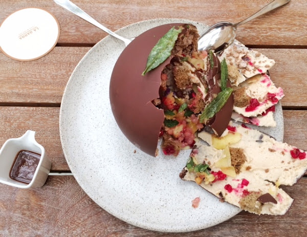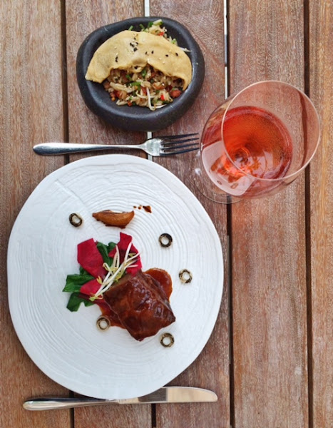 Főételnek Dani egy fehér húsú halat kért hozzá helyi fehérbort, én pedig marhapofát egy perui, vörösnek nevezett, de inkább rozéra emlékeztető, furcsa karamellás ízű, kicsit félédesbe hajló borral. A sommelier háromszor is megkérdezte, biztos ezt kérem-e, szóval lehet, hogy nem számít valami jónak… :)A végén rendeltünk két édességet, de a pincér visszaszaladt a konyhából, hogy inkább csak egyet kérjünk, mert a csokibomba nagyon nagy… Ez volt az új étlap első napja, így még ő sem volt mindneről képben. És tényleg a csokibomba hatalmas volt: kívül ropogós tejcsoki, belül egy kevés tészta, és mindenféle gyümölcs, menta meg fagyi és az elején az egész finoman füstölt a folyékony nitrogéntől. Nagyon szép volt, és rossz sem, bár nekem a sok dolog nem állt össze egésszé, vagy csak nem az ízlésem. A többi étel viszont szerintem is hibátlan volt.