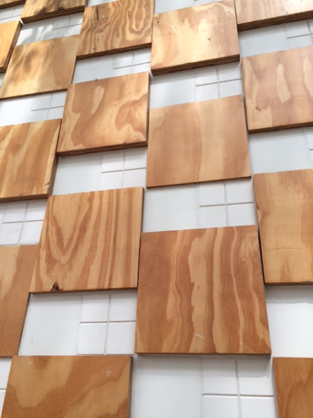 A padló mintáját leköveti a fal. A legnagyobb négyzetek helyére rétegelt lemez került változó vastagságban.