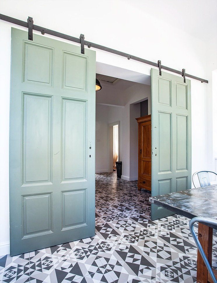 A másik pedig régi nyaralónk két megmentett ajtajából készült, oldalfali fémszerkezetre függesztett megoldással készült tolóajtó: