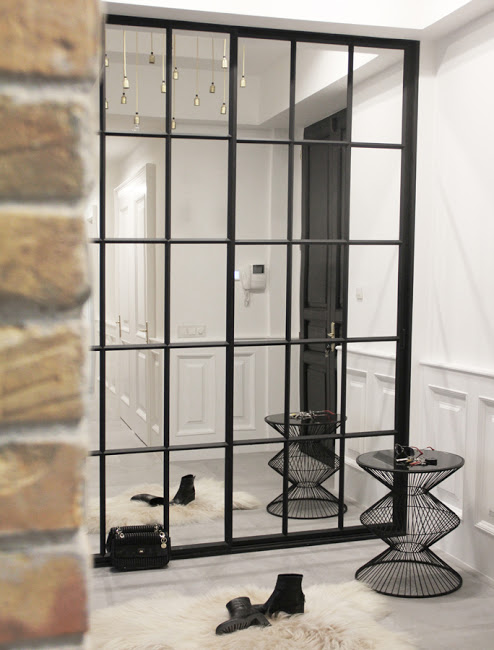 Az egyik egy fém szerkezettel készült üveg tolóajtó, amely egy jó nagy előszobaszekrényt rejt: