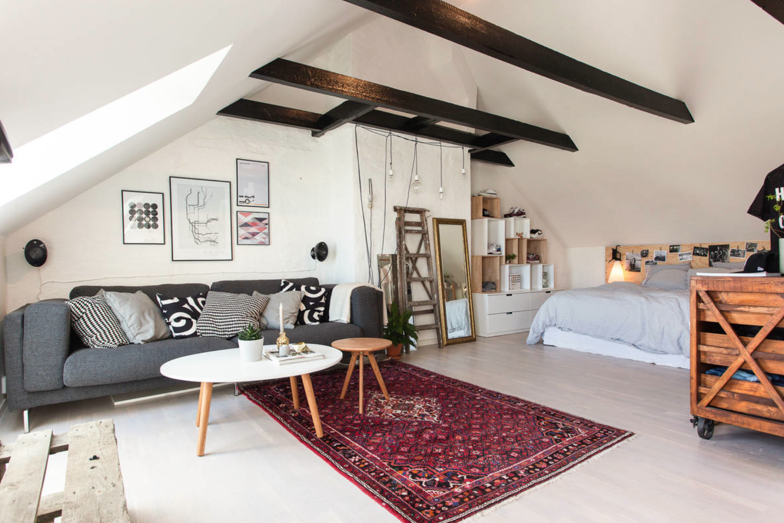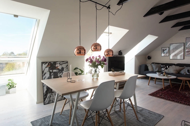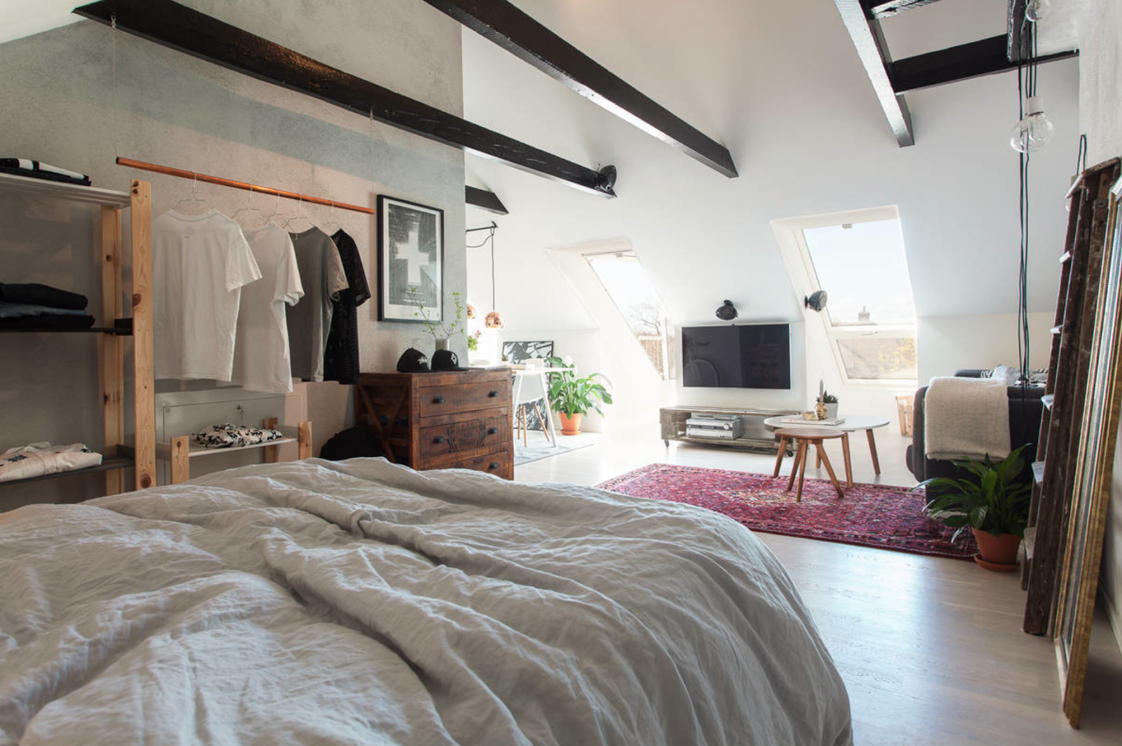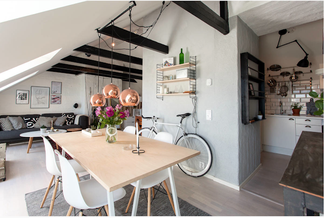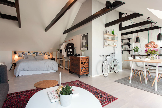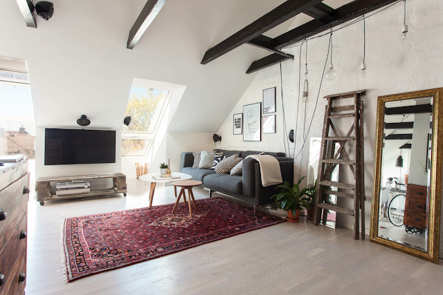 Ez a tetőtéri egy légterű lakás is nagyon bejön, bírom az eklektikus össze-visszaságot, talán csak lámpa ügyben érzem kicsit soknak a felhozatalt… Ezzel együtt hangulatában, stílusában közel áll hozzám ez a kislakás.